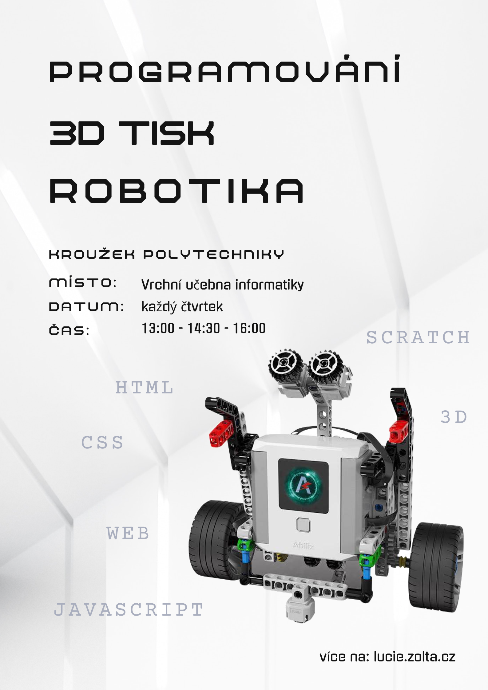 Na ZŠ Horní Bečva probíhá kroužek polytechniky. Taková všehochuť od robotiky, přes programování (javascript), tvorbu webu, 3D grafiky a 3D tisku. Kroužek je možná silné slovo, lépe by se hodilo konzultační hodiny. Děti budou mít možnost buď si zkusit něco z nabízených projektů, nebo si můžou dělat vlastní projekty, které je zajímají a ptát se na to, co potřebují vědět.