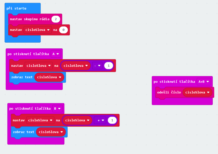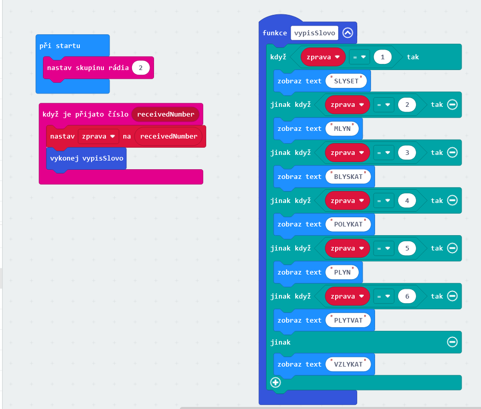 Na demonstraci radiove komunikace mezi microbity, jsme vytvorili jednoduchy tahak. Jeden microbit odesila cislo a druhy na zaklade prijateho cisla zobrazi dane vyjmenovane slovo.
