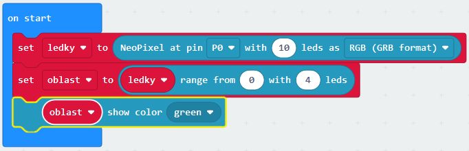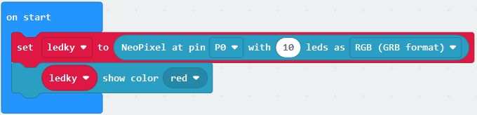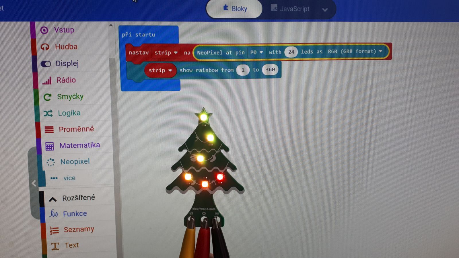 Vánoční stromek microbitu je složitější než jsem si myslela. Předpoklad že nacvaknu stromek a pustím tam signál binárního čísla a barvy byl mylný. K připojení ledkového vánočního stromku je třeba přistupovat přes rozšíření make code studia a to o blok Neopixel.