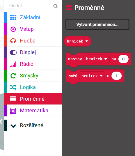 Já si založila proměnnou s názvem hrnicek, jak můžete vidět na obrázku vlevo. Tak se mi tam vytvořili 3 nové příkazy (puzzlíky).