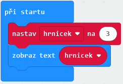3) Jak tyto nové příkazy použít vidíte na obrázku dole. Při spuštění nastavíme promennou hrnicek=3 a v dalším příkazu vypíšeme hodnotu hrnicku. Na displeji se nám po spuštění tohot programu objeví trojka.