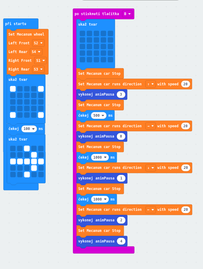 Následující kód rozpohybuje buginu do všech stran. Po stisku tlačítka B objede čtverec (dozadu, doprava,dopředu a dolů). Místo funkce animPausa, lze použít obyčejné čekej(4000). Jde o čas po který se buguna pohybuje daným směrem. Je třeba rozšíření Wukong.