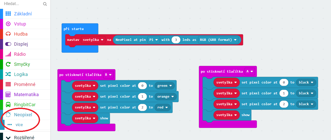 Rozsvícení a zhasnutí všech barev na semaforu, využívá následujících příkazů, rozšíření Neopixel. Pozor některé použité příkazy jsou v záložce více...