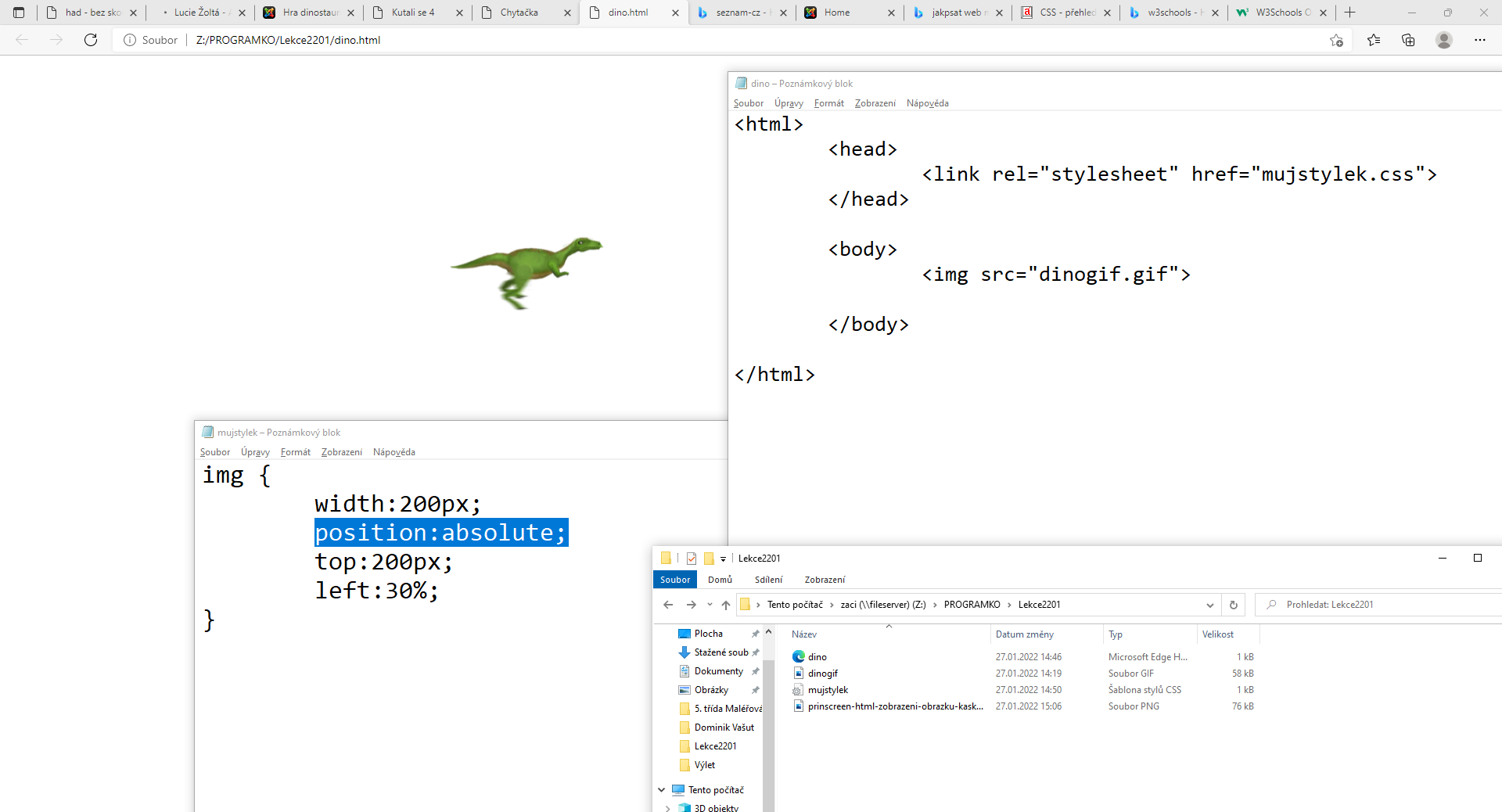 2. Vytvořili jsme html dokument zobrazující obrázek tohoto dinosaura (dino.html zdrojak na obr. v pravem okně)