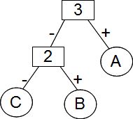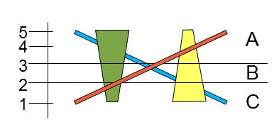 BSP strom je binární strom nesoucí informaci o rozdělení prostorů. Pokud rozdělíme prostor v němž se nachází naše barevné pruhy rovinou f(z)=3 vzniknou nám dva poloprostory - hodní A a spodní B'. A ty můžeme dělit dál. Pro ukázku jsme ještě B' rozdělili na B a C rovinou f(z) = 2.