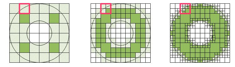 V dalším kroku se řeší ty voxely, které jsou nerozhodné, tedy částečně obsaženy v tělese. Takovýto voxel ležíci na hranici tělesa rozdělím na osm menších voxelů. Na obrázku níže je tento postup znázorněn v 2D prostoru, proto se voxely dělí jen na čtyři části. V prostoru se však krychle rozdělí na osm menších krychliček.