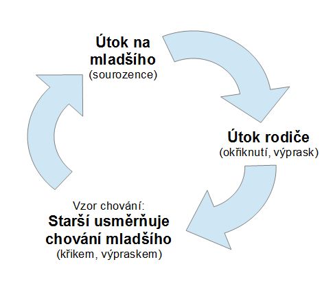 No a v případě útoků na mladšího sourozence to bylo stejné. Tím, že jsem starší kárala, za její chování k mladšímu jsem jí zároveň dávala vzor chování, který zase jen kopírovala - máma (starší, silnější) křičí/bije/vyhrožuje, když já (mladší, slabší) dělám něco, co se jí nelíbí (křičm/biju/vyhrožuji bráchovi).
