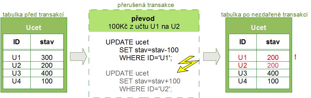 Na následujícím obrázku je znázorněná nepodařená transakce, která byla uprostřed přerušena čímž narušila konzistenci databáze.