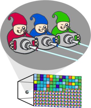 • Katodová obrazovka - velká těžká bedna. Funguje na principu elektronových paprsků, které při dopadu na obrazovku (luminoforovouv vrstvu) rozsvítí daný pixel. U barevných obrazovek jsou ty paprsky tři a každý míří do trochu jiné části pixelu. Pixel je totiž rozdělen na tři části (červenou, modrou a zelenou) a každý z paprsků rozsvítí tu svojí část (viz. obrázek vlevo :)).