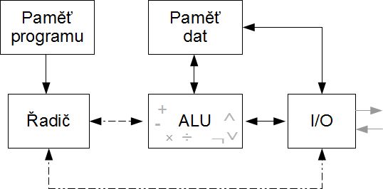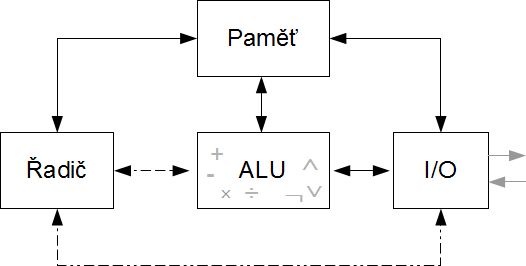 • Řadič - řídicí jednotka řídí činnost všech částí počítače pomocí řídících signálů. Řadiči zpět jsou zasílané stavové hlášení.