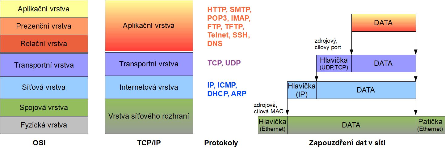Následující obrázek ukazuje vztah mezi OSI a TCP/IP a ukázku zapouzdření dat v jednotlivých vrstvách