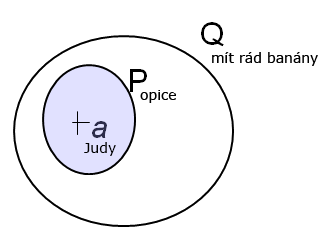 Všechny opice (P) mají rády banány (Q). Judy je opice. _______________________ -> Judy má ráda banány.