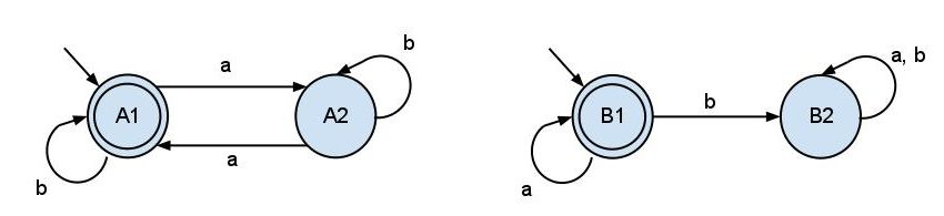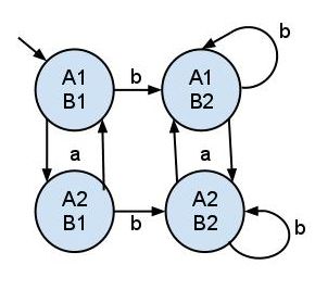 - začínám ve stavu A1B1. Kam se z počátečního stavu dostanu v případě symbolu 'a'? Ze stavu A1 -a-> A2 a ze stavu B1 -a-> B1. V případě symbolu 'b': A1 -b-> A1, B1 -b-> B2
